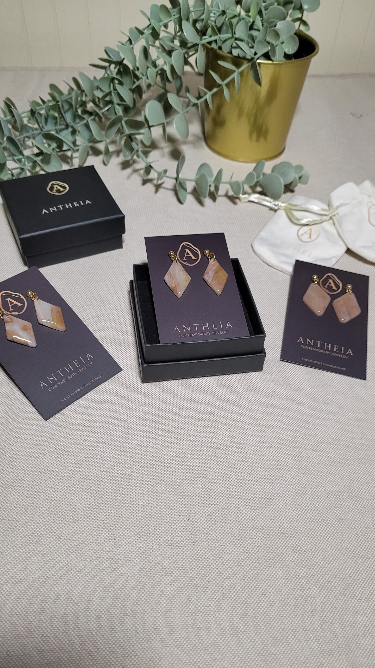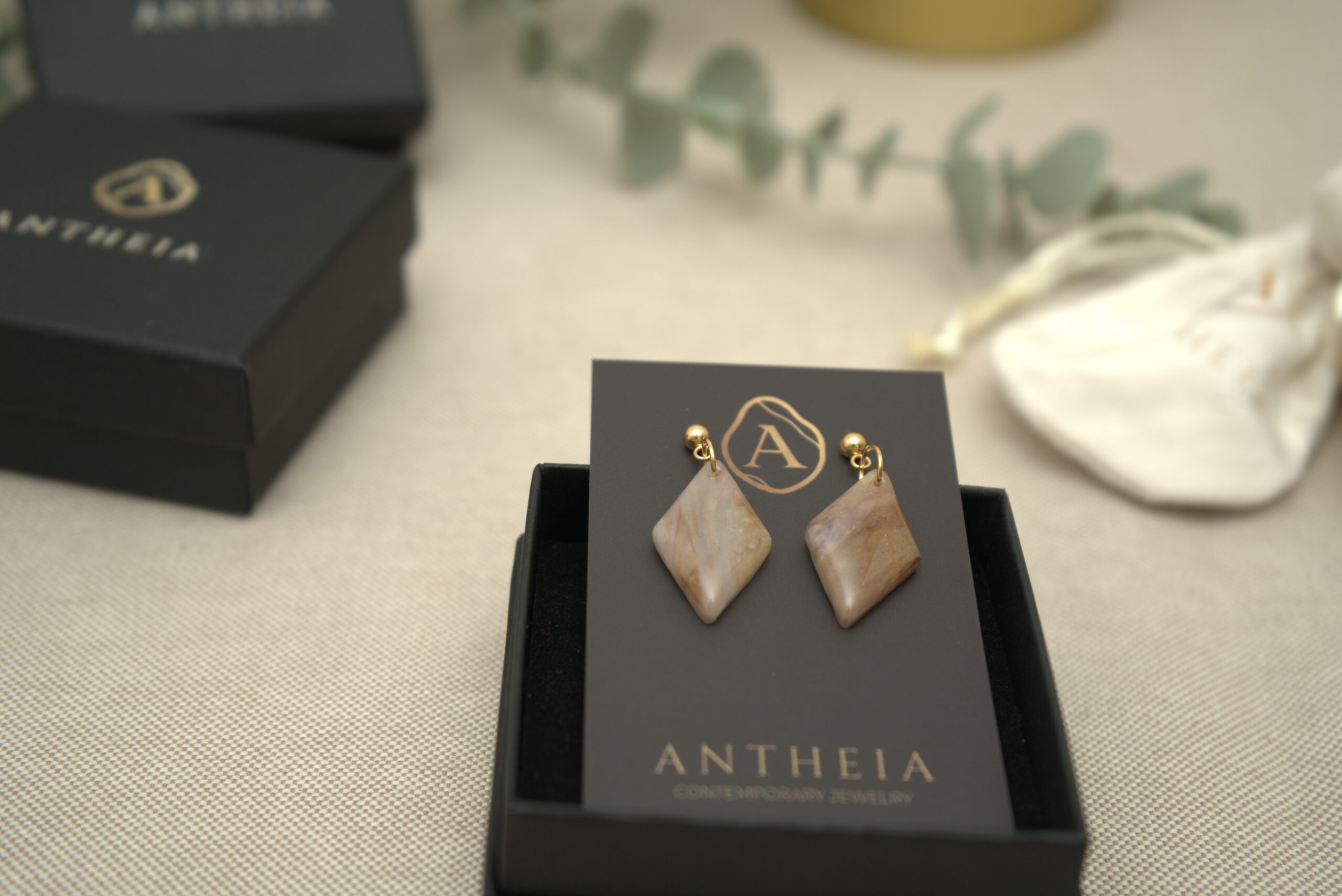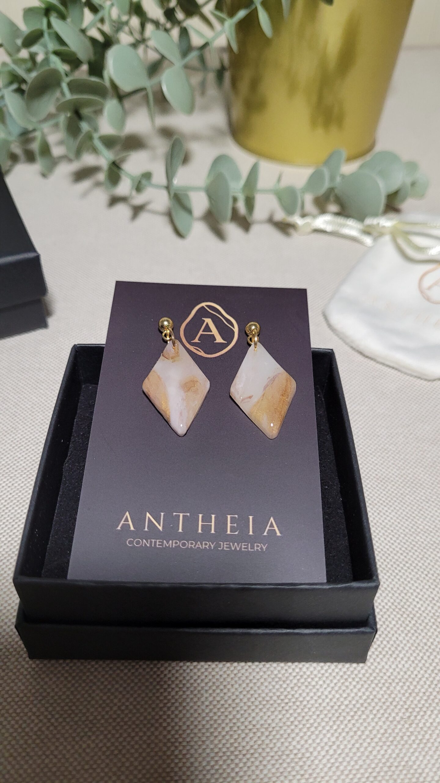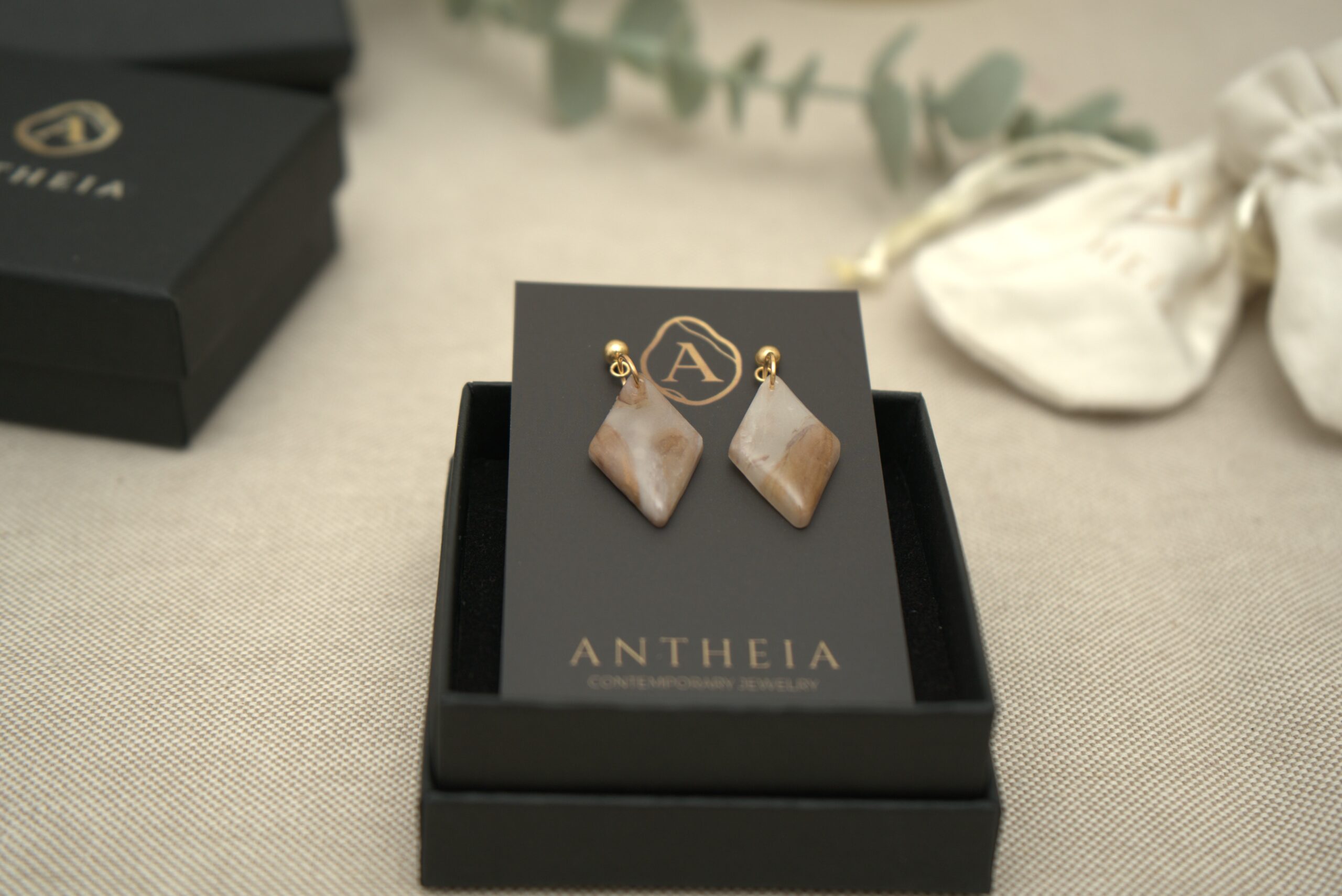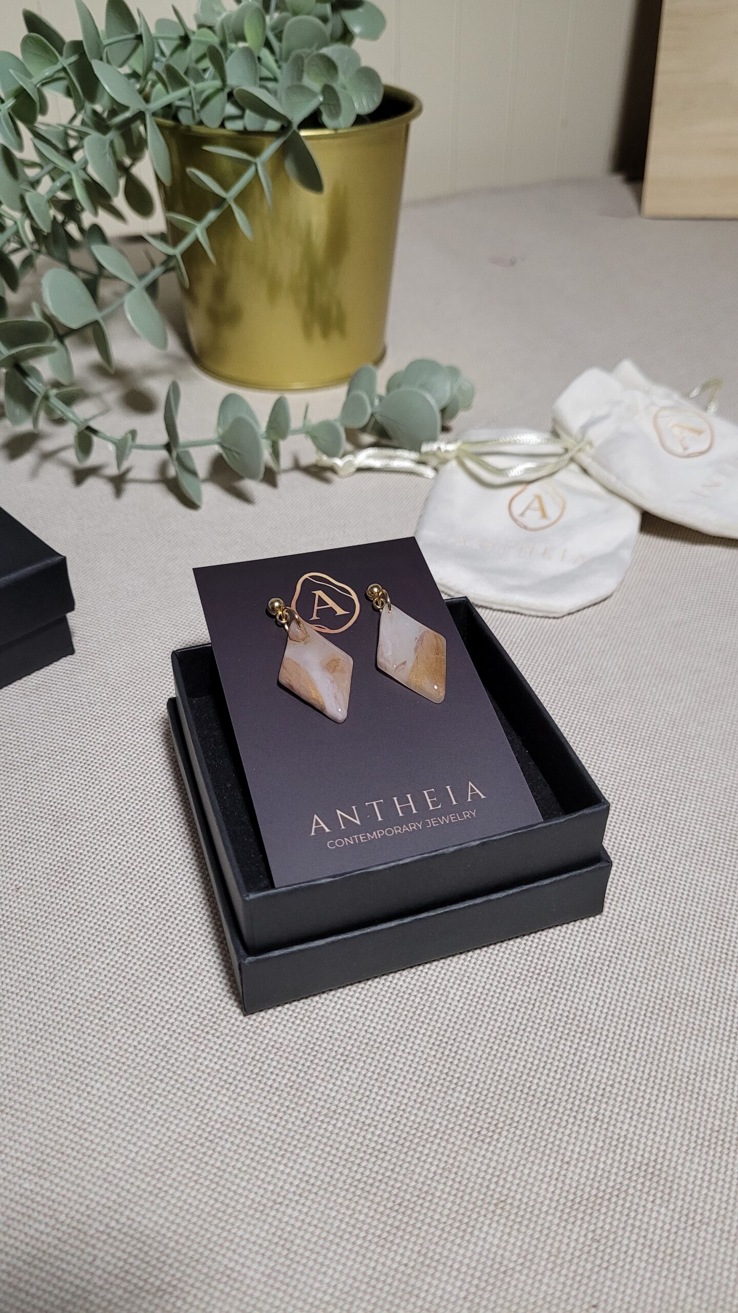 Immerse yourself in the soothing colors of our Caffe Latte Collection. This pair of geometric, diamond-shaped earrings is a harmonic blend of white and warm brown, resembling perfectly frothed milk with a drop of aromatic essence.