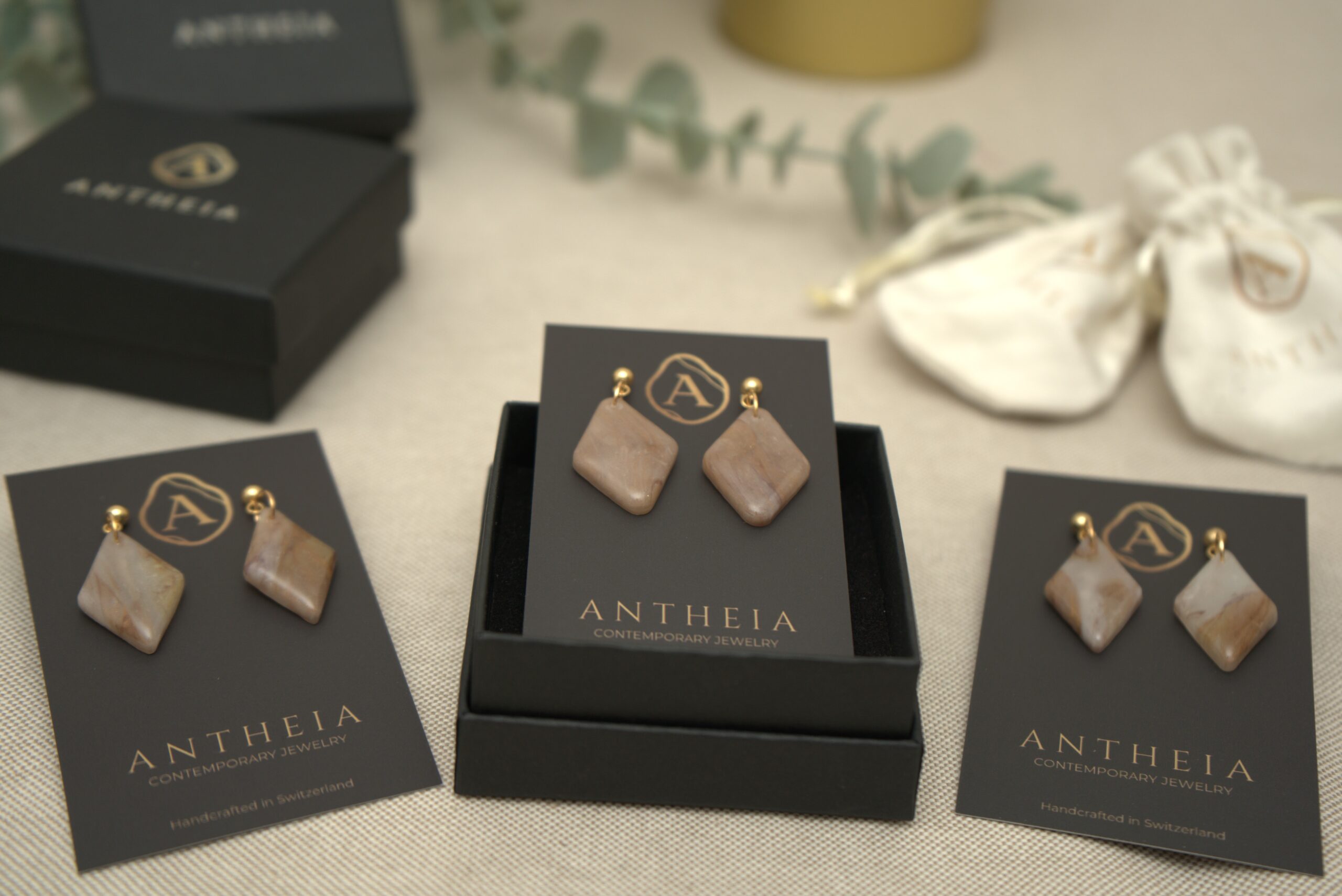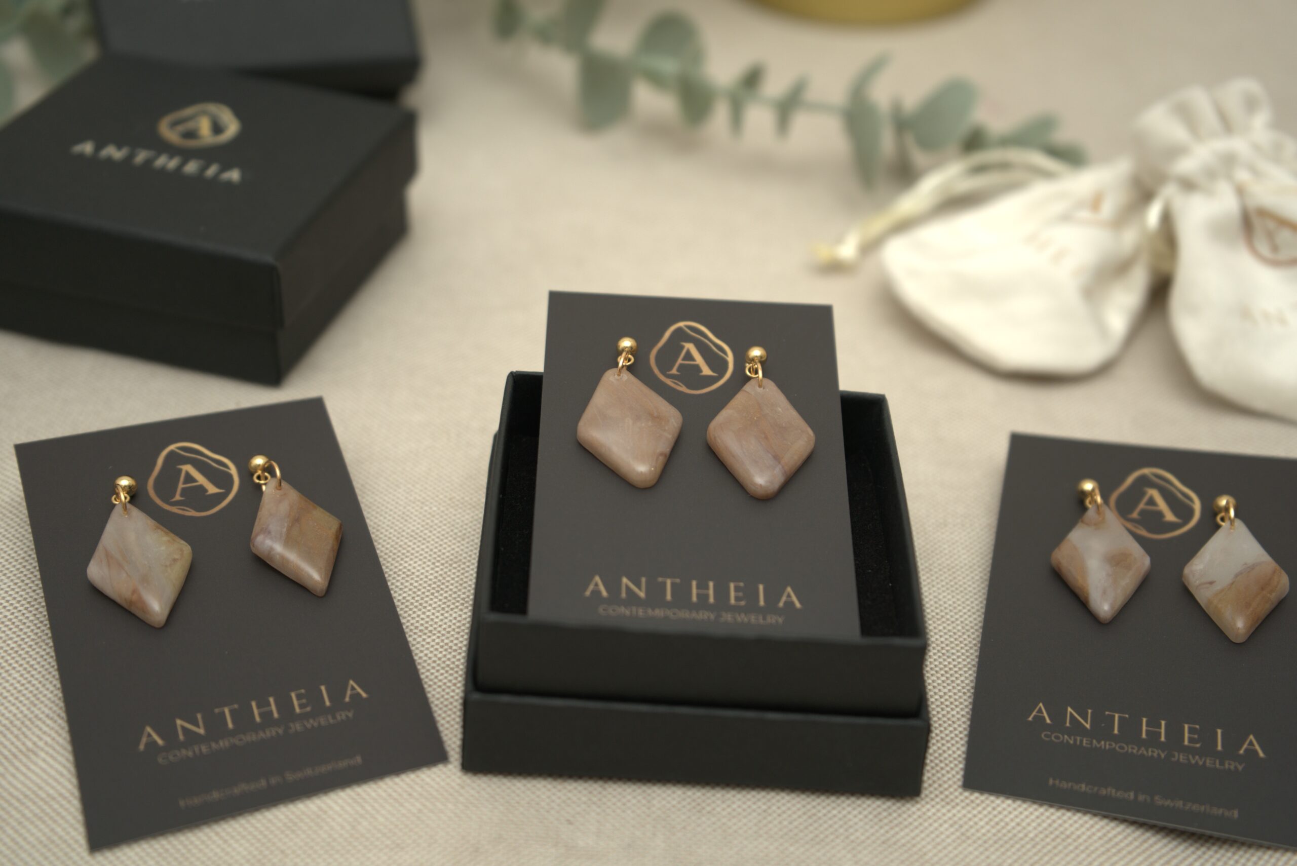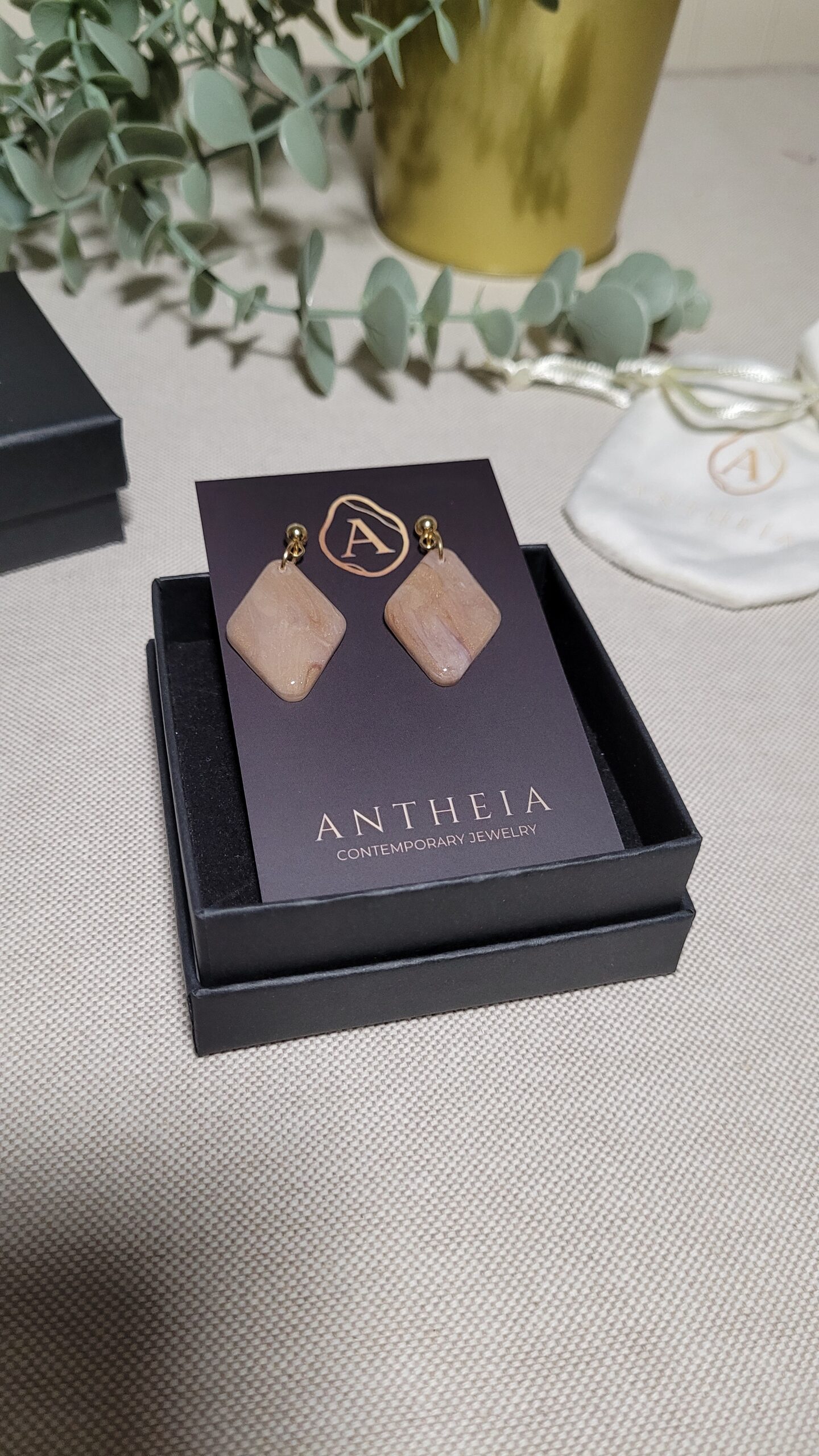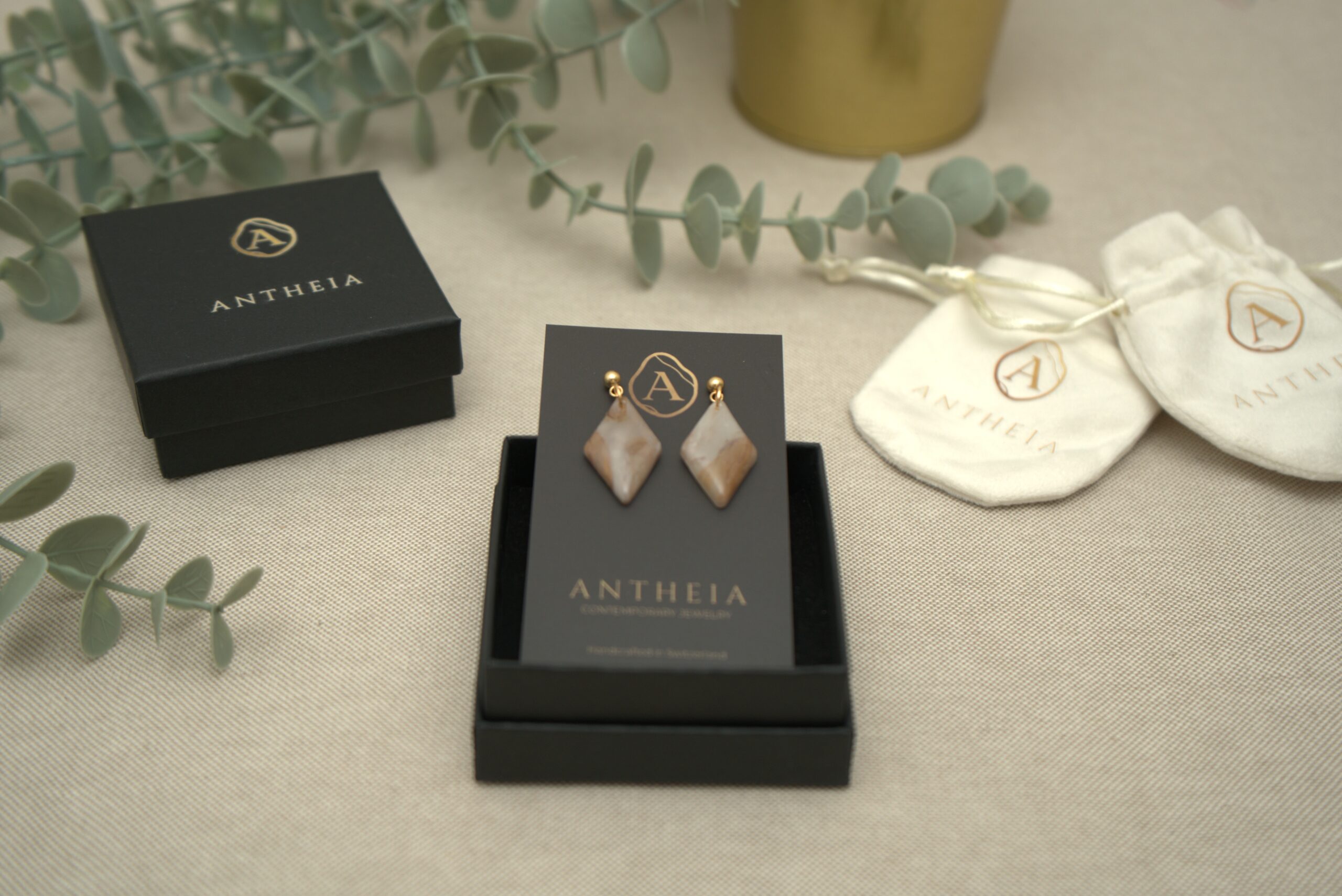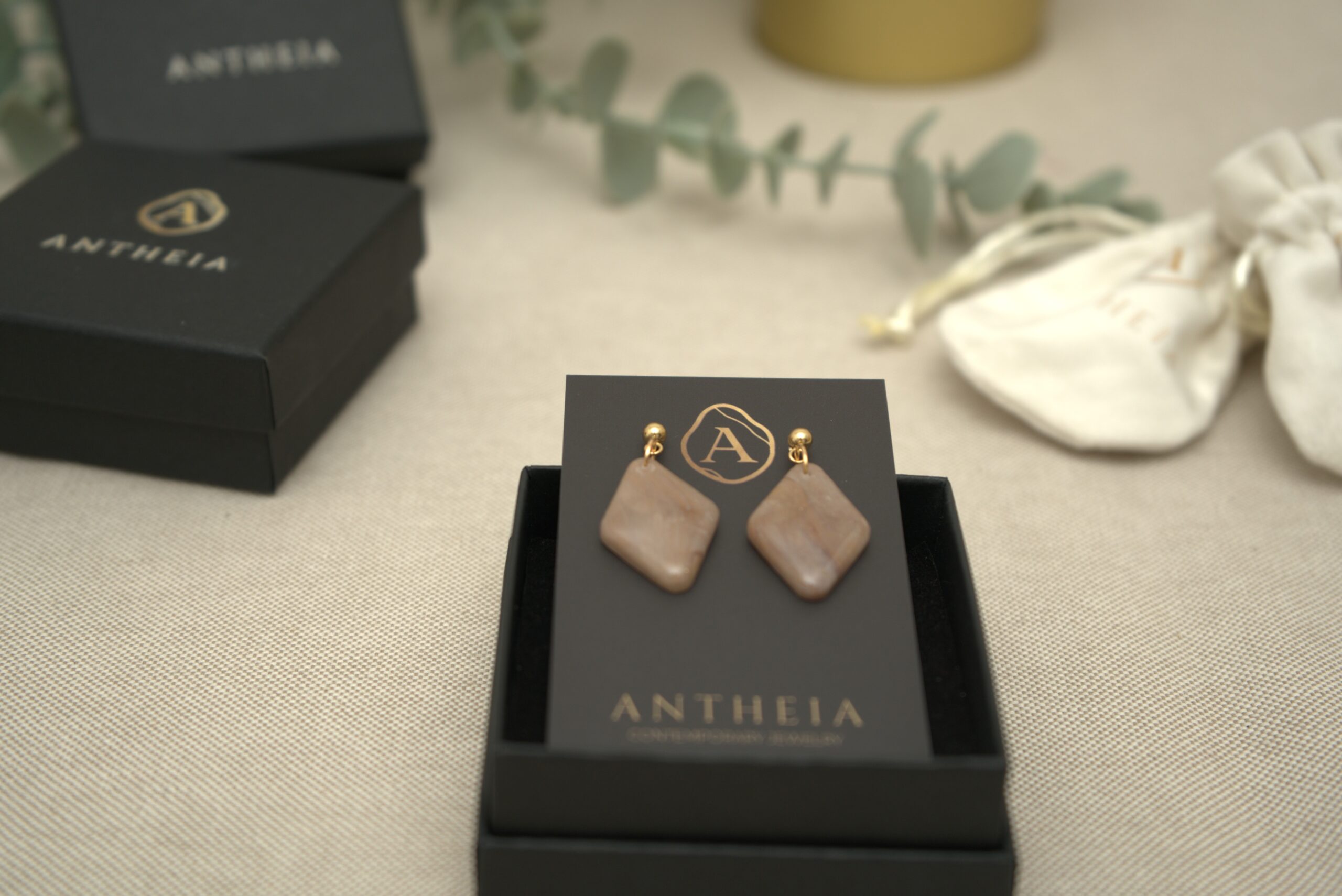 Immerse yourself in the soothing colors of our Caffe Latte Collection. This pair of geometric, diamond-shaped earrings is a harmonic blend of white and warm brown, resembling perfectly frothed milk with a drop of aromatic essence.