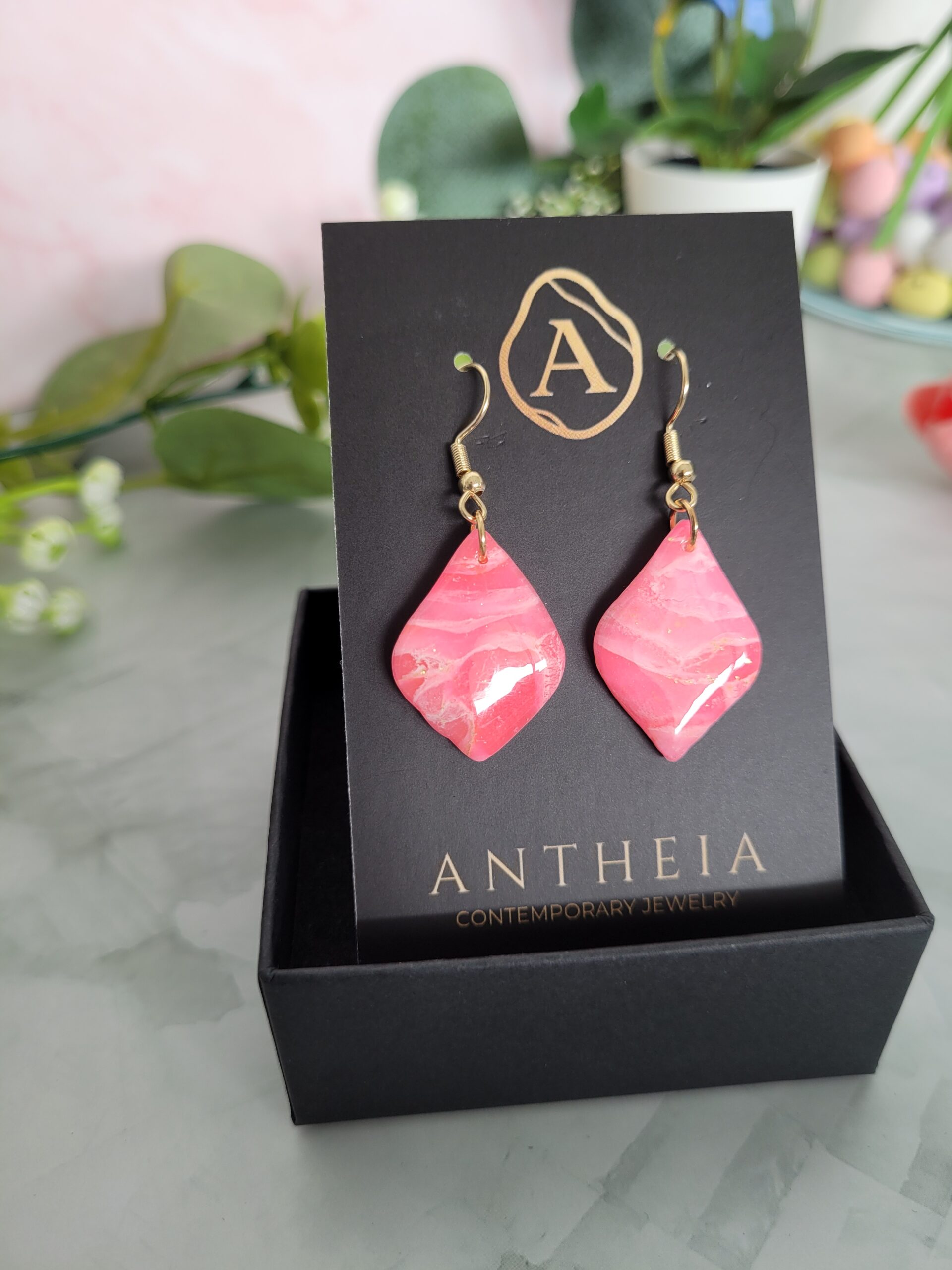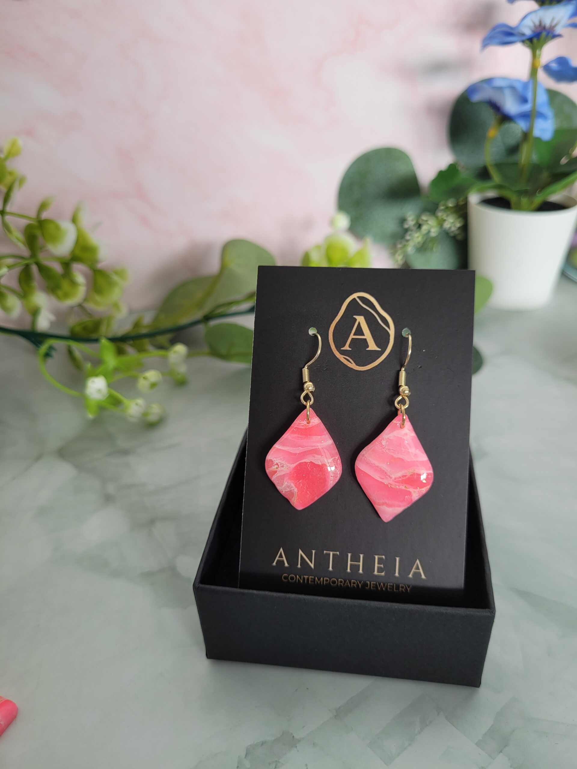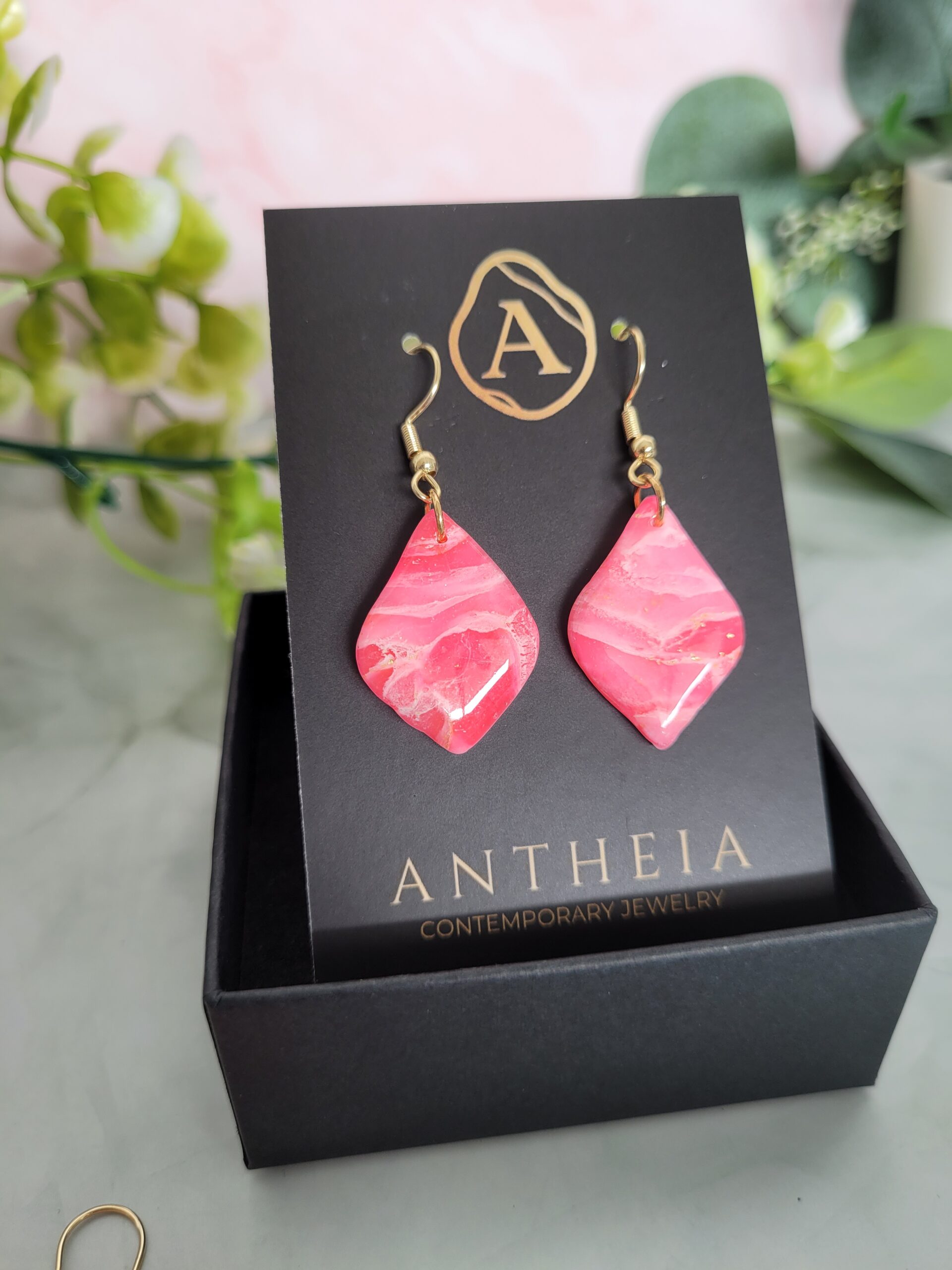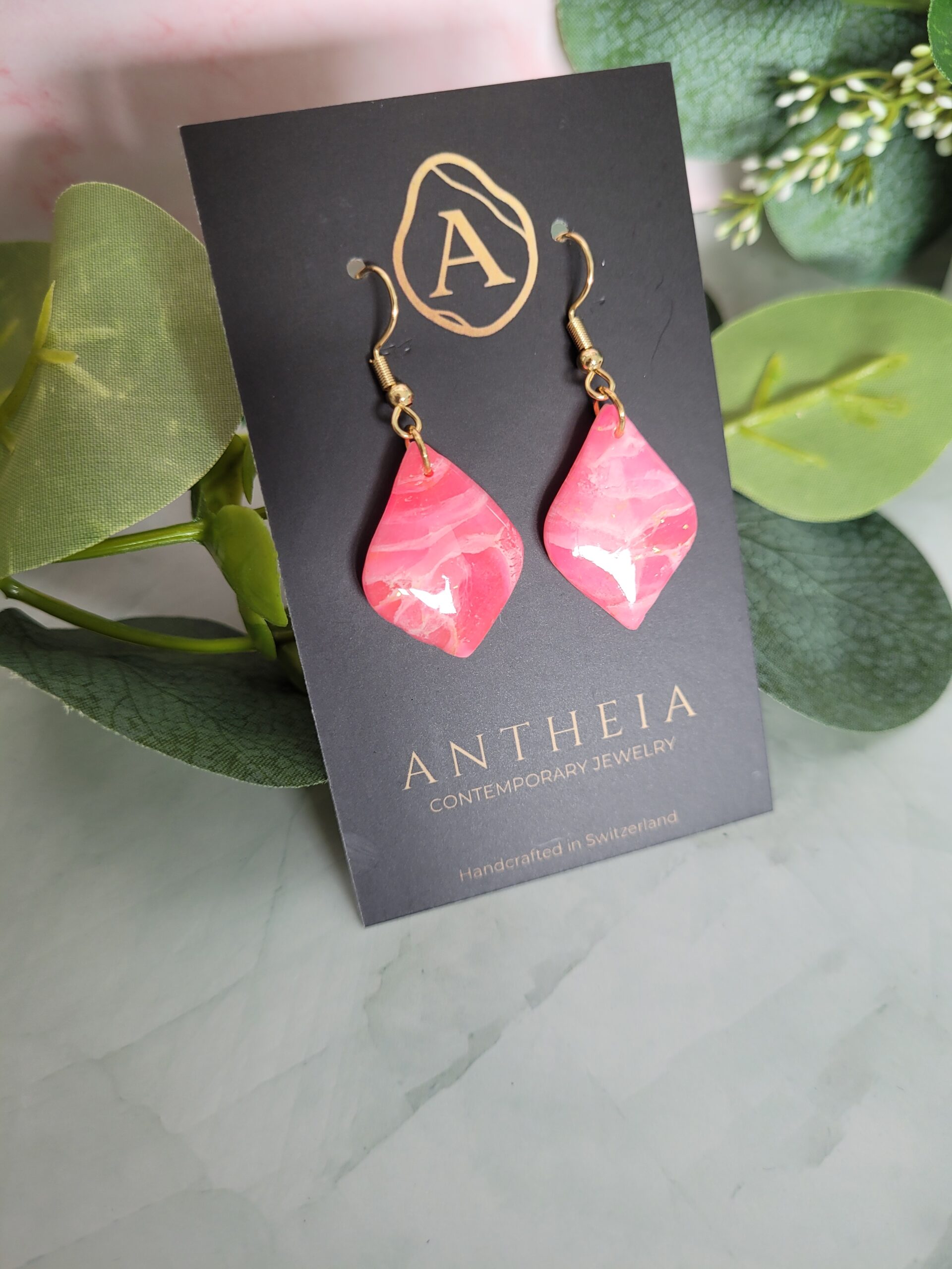 Nowoczesna, geometryczna elegancja. Te wykonane kolczyki w kolorze rombów w żywym kolorze fuksji charakteryzują się unikalną marmurową fakturą i subtelnymi akcentami ze złotych liści. Dostępne w dwóch rozwiązaniach, aby być gotowym do Twojego stylu.