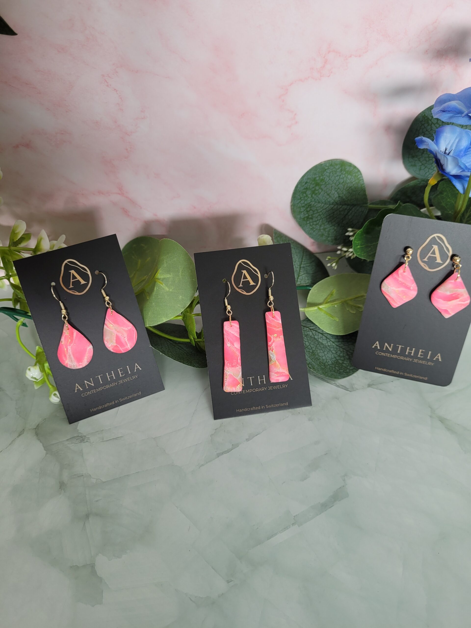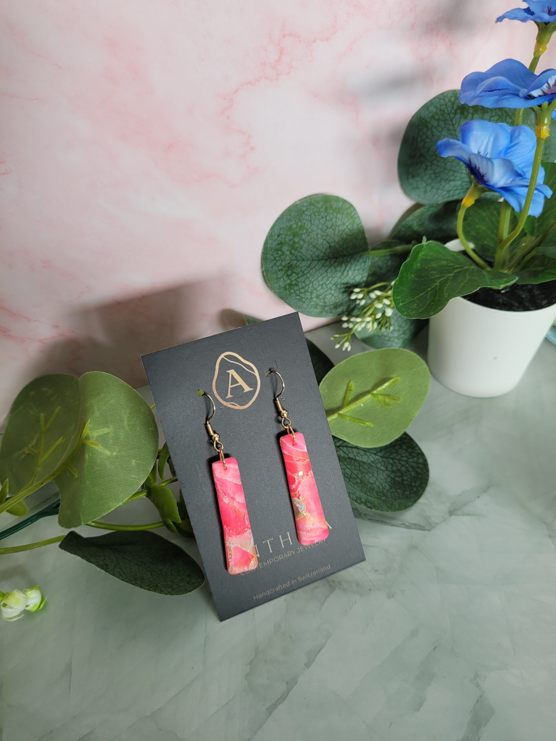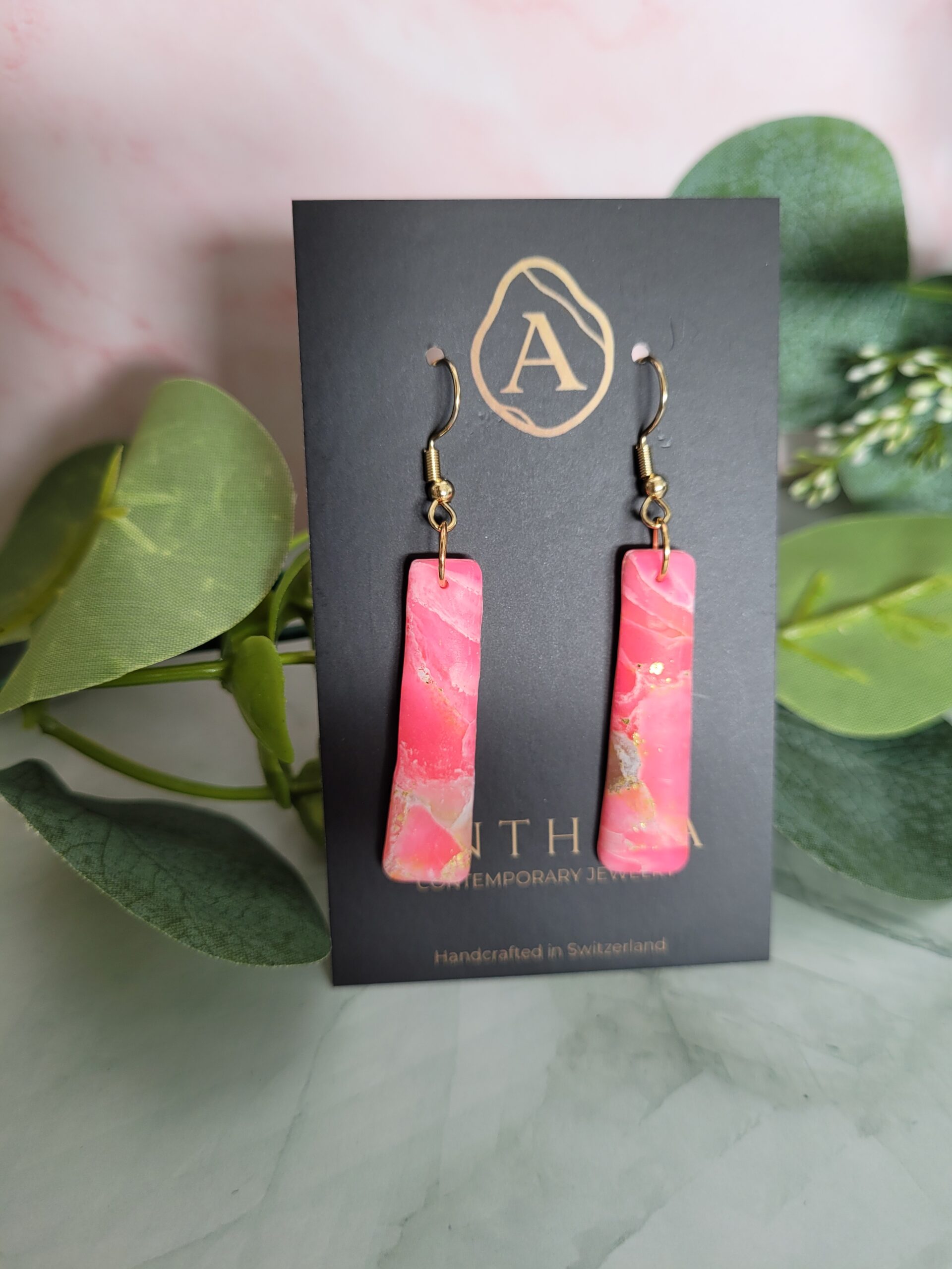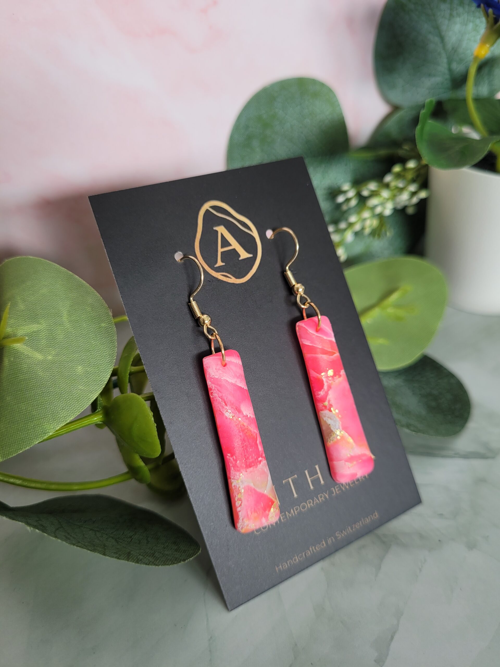 Sleek, geometric, and bold. These elongated bar earrings are a statement of modern minimalism. The deep fuchsia palette infused with shimmering gold particles creates a sophisticated look that transitions perfectly from day to night.