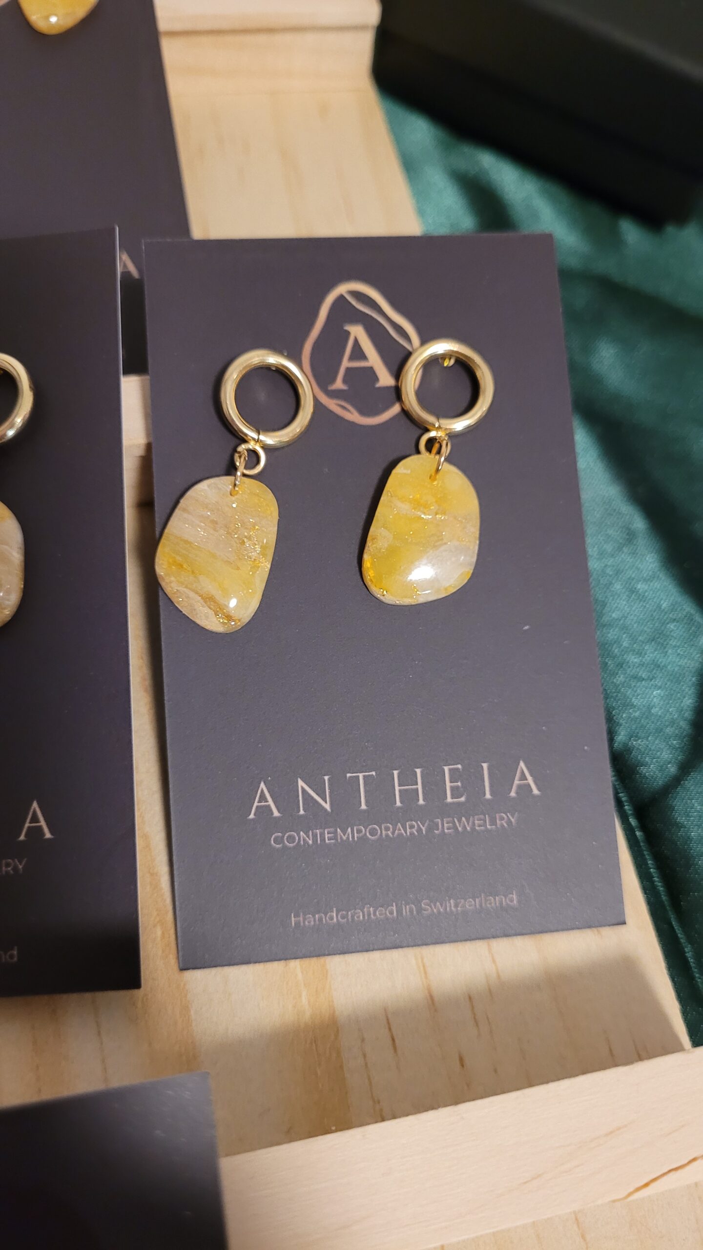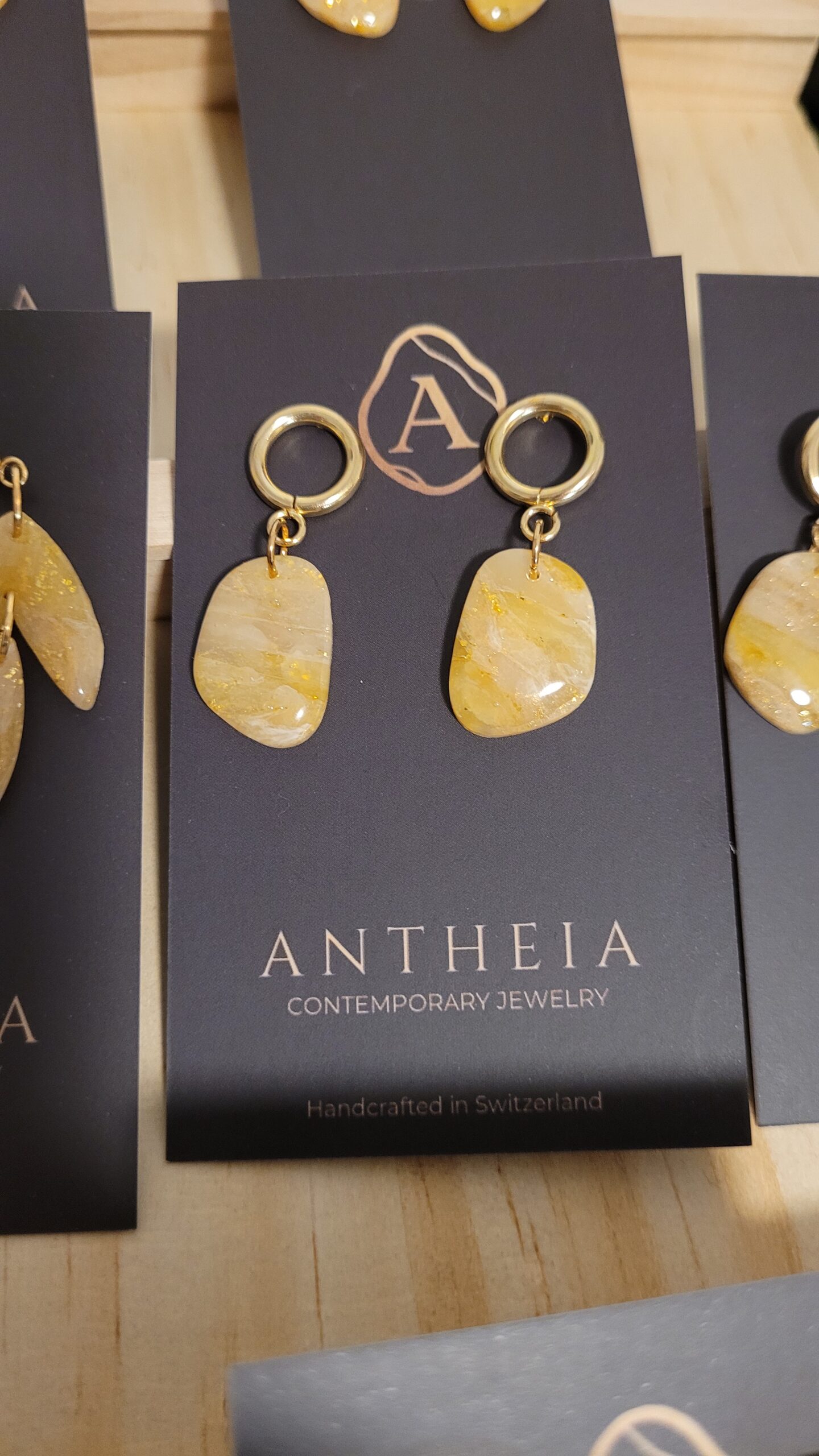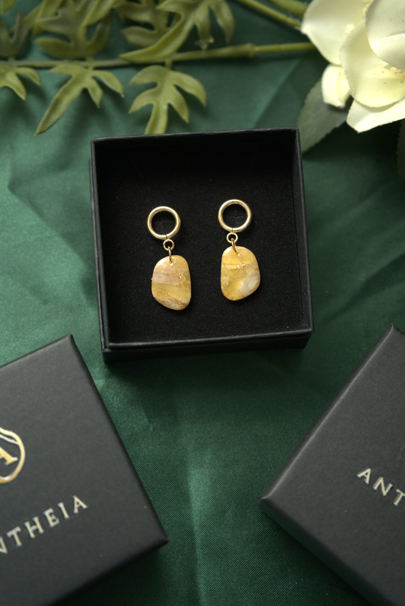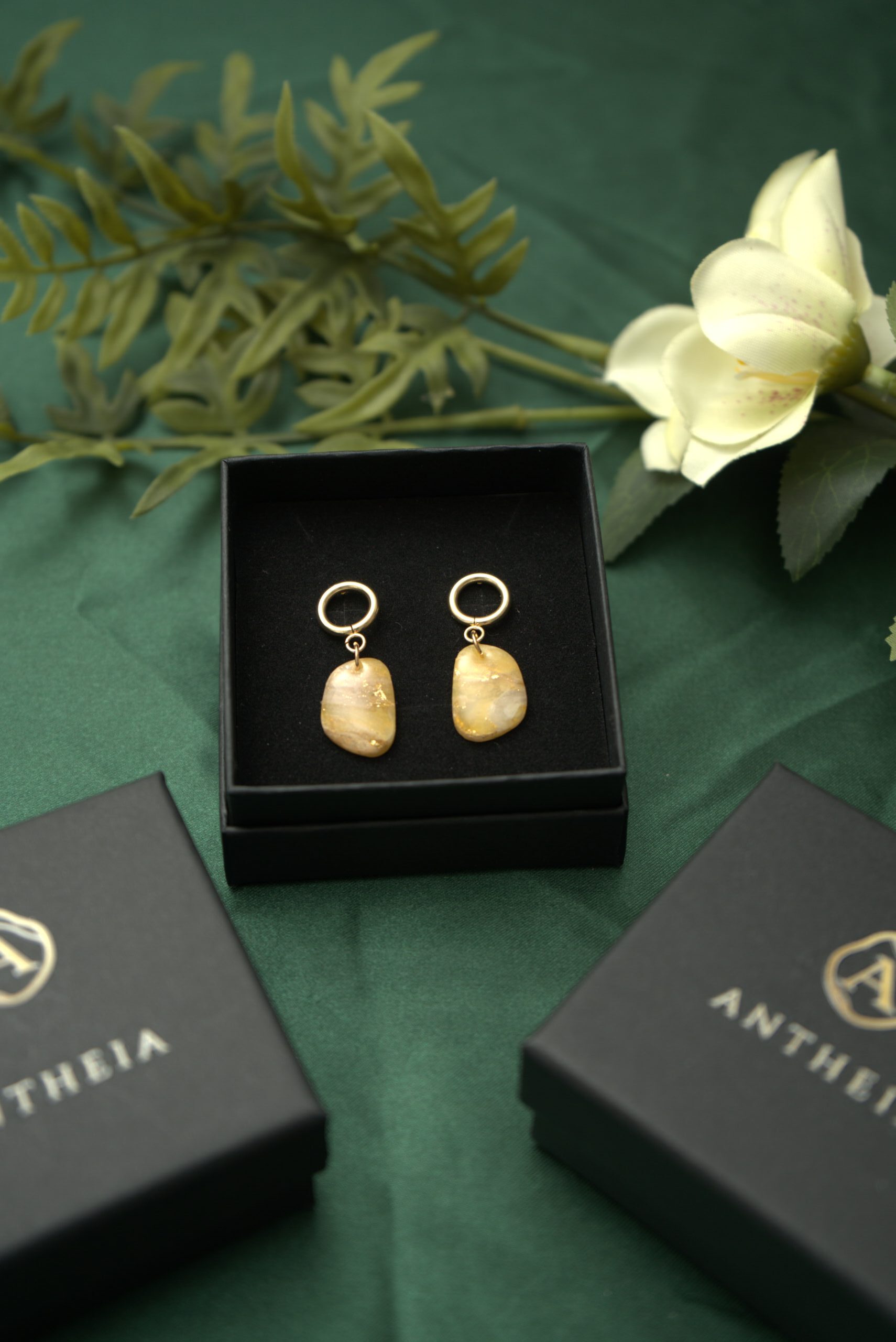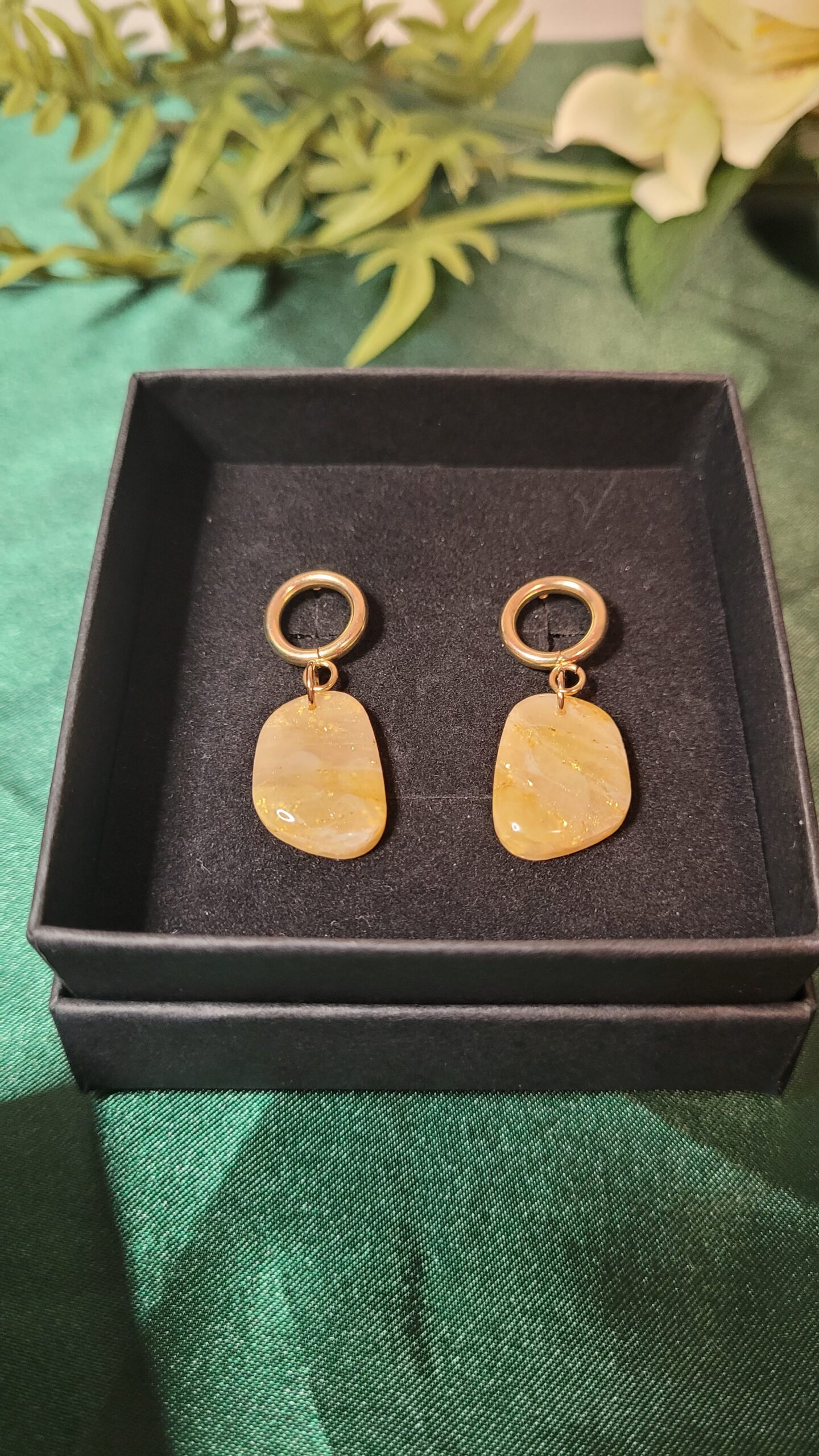 Brighten your day with the “Golden Sunbeam – Organic Hoop Earrings” Designed to capture the radiance of sunlight, these earrings feature a delicate blend of honey-toned translucent clay and genuine gold leaf, finished with a high-gloss crystalline resin.